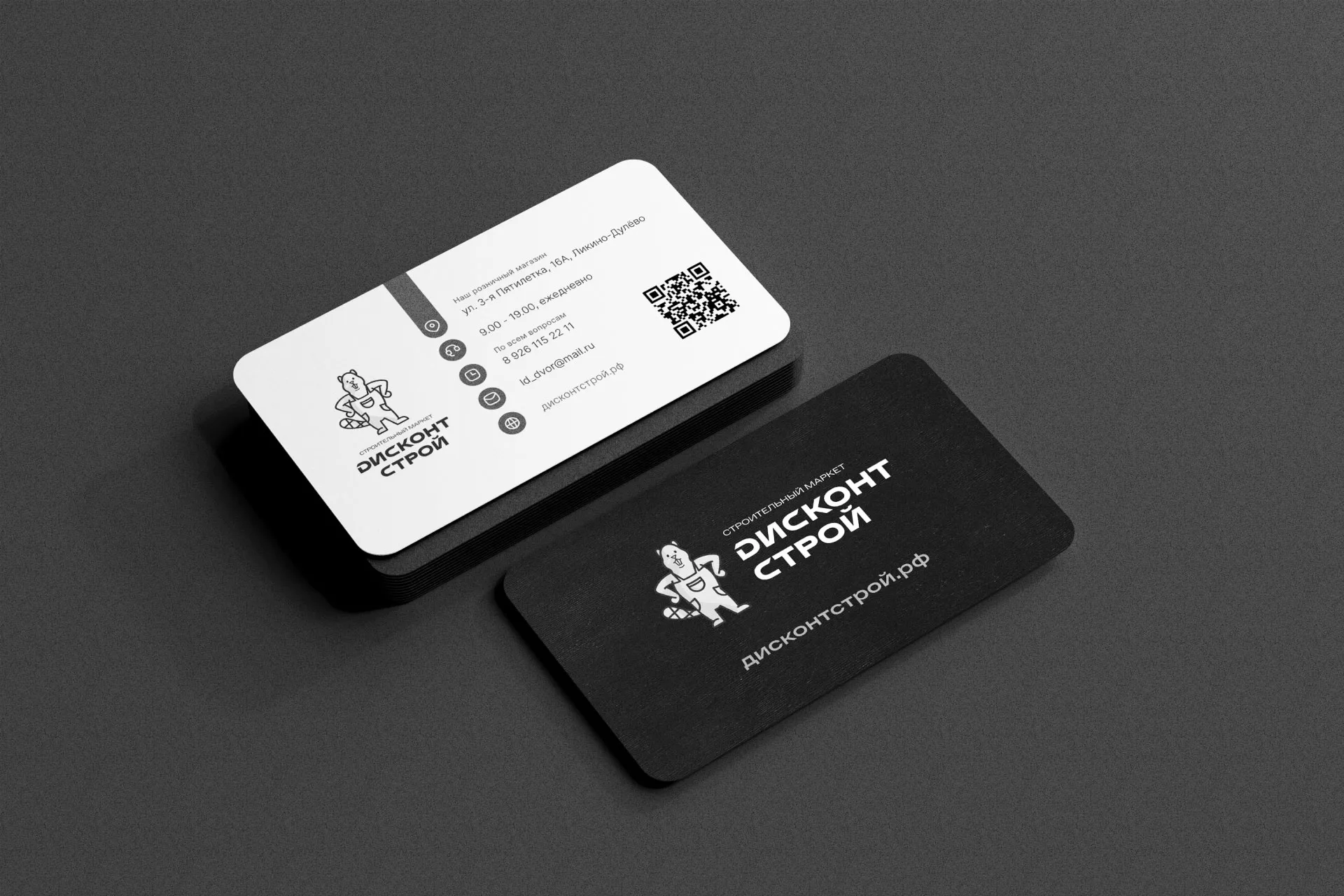 Вместе с логотипом, мы предложили заказчику сразу визуализацию логотипа в возможном дизайне на фирменный визитках магазина «Дисконт Строй» в Сунже.