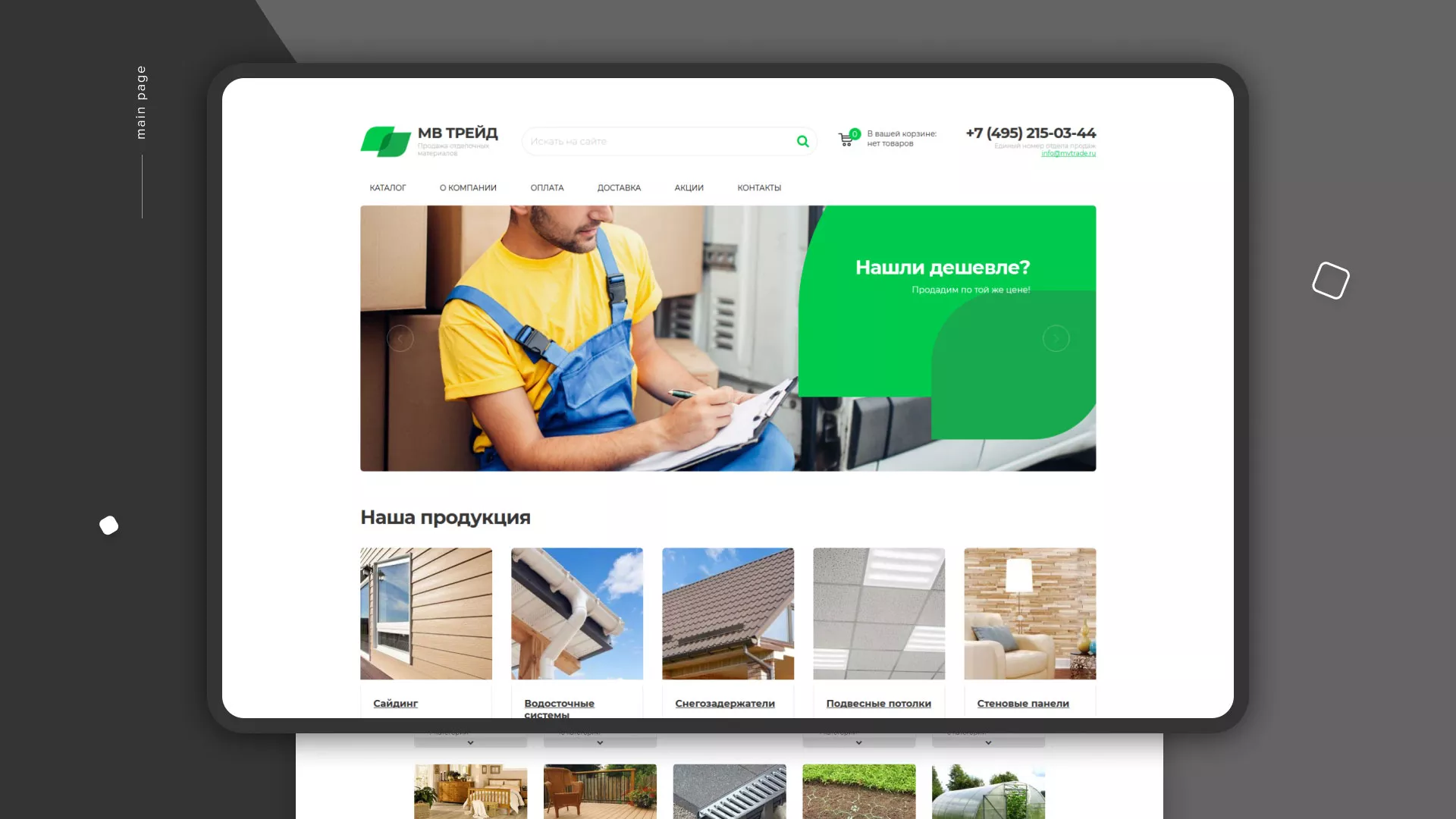 После согласования прототипа мы приступили к прорисовке страниц сайта. Главным трендом сейчас является mobile-first, и адаптация сайта под мобильные устройства влияет на результат поискового продвижения сайтов. Нашей задачей стало — отрисовать не только десктопный дизайн и прототип, но и учесть адаптивность к мобильным и планшетным устройствам. Именно с них сайт получает сейчас более 50% трафика и заказов. В версии для смартфонов и планшетов предусмотрен весь функционал для простого и быстрого поиска, выбора, заказа товаров и оформления покупки онлайн.