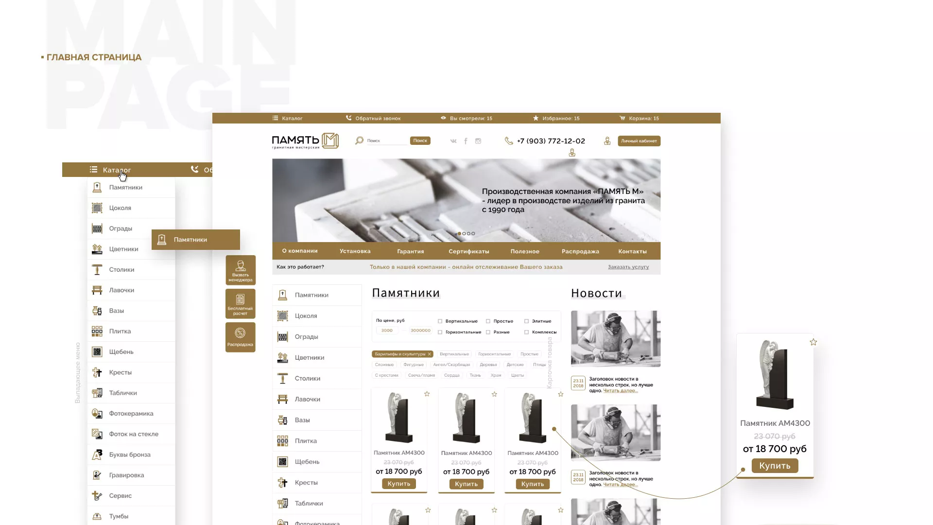 Разработка логотипа, фирменного стиля и сайта в Сунже для компании «Память-М». Компания является предприятием по изготовлению всех видов надгробных сооружений: памятников, цоколей на могилу, оградок, столов, лавочек, ваз, балясин, плитки, мемориальных комплексов. Компании «Память-М» изготавливает все виды мемориальных изделий на собственном производстве в Сунже.